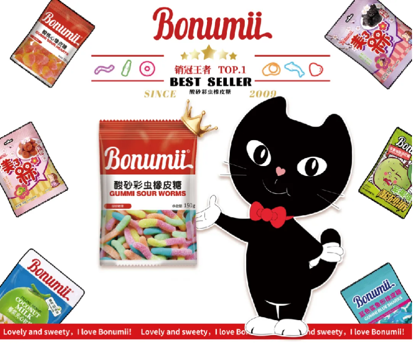 在软糖红海中,我们提供了极高辨识度的产品。独特的品名、形态和口感本身就是“自带货”的陈列亮点和社交谈资,能自然吸引尝鲜购买。同时,其“槑”字文化梗、全食展走秀事件及媒体背书,为渠道提供了丰富的现成内容营销素材,降低引流成本,提升单品附加值。