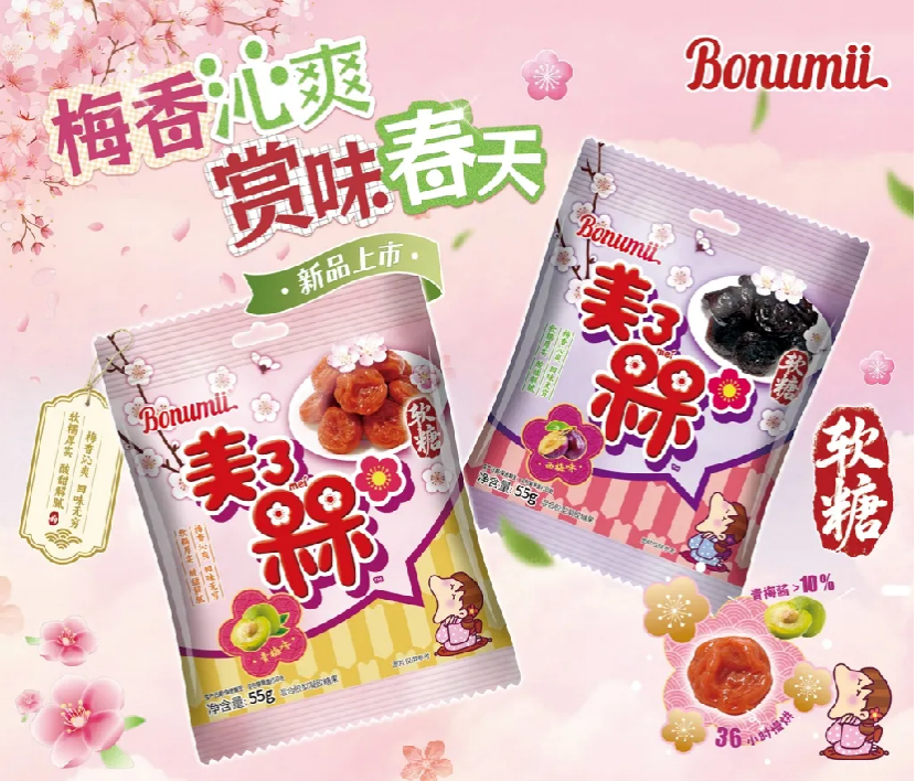 品类首创,形态创新:首款“神还原”传统蜜饯形态与风味的软糖。并非简单调味,而是从物理形态(外韧内柔的嚼感)到风味层次(前中后调的完整梅子体验)的全面复刻,开创“蜜饯软糖”融合。