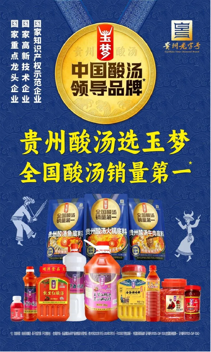 玉梦酸汤:精选高山小番茄、贵州线椒等原生态食材,土坛自然发酵365天酿制。具有汤色鲜红、香气纯正,味酸回甜的特点,畅销全国及海外市场,连续三年全国酸汤销量第一!