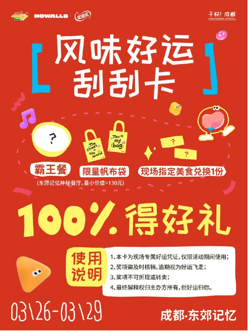 如果你运气很好,那不妨来试试我们的「风味好运刮刮卡」。好礼清单已经备好:限量帆布袋、现场商家美食,甚至还有东郊记忆神秘餐厅的霸王餐(价值130元起)!